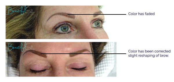 I worked with my client to customize a color pigment that would compliment her natural color without picking up any undesirable hues such as blues, greys or especially that salmony-pink. Then I color corrected the entire brow and reshaped the brow slightly to better accentuate her beautiful eyes.