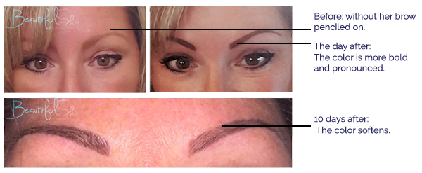 The bottom picture on the right is 10 days after the procedure. Sometimes a follow up is needed 6-8 weeks later to touch up any faded areas for a long lasting look! Lyn recently had an 8 week follow up. I’ll post the final picture once Lyn is completely healed so you can see the end result!