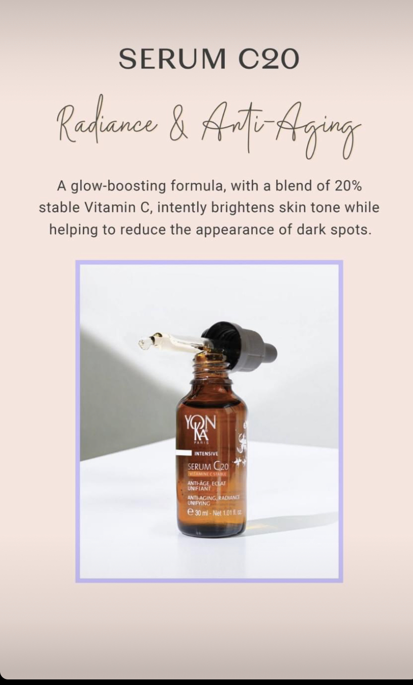 Apply Yon-Ka Serum C20 alone or combined with your usual skin cream daily or as an intensive course of treatment to increase skin radiance, and combat wrinkles and dark spots.